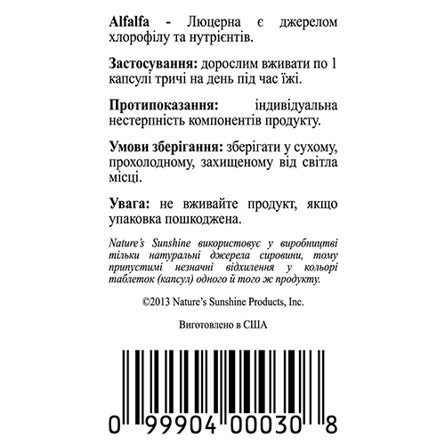 Состав - 1 капсула: надземные части люцерны (Medicago sativa) - 340 мг.