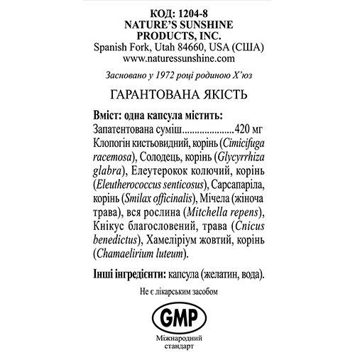 Состав - 1 капсула: корень клопогона кистевидного (Cimicifuga rasemosa) - 84 мг; корень солодки голой (Glycyrrhiza glabra) - 71 мг; корень элеутерококка колючего (Eleutherococcus senticosus) - 62 мг; корень сассапариля лекарственного (Smilax officinalis) - 61 мг; листья и стебли митчеллы ползучей (Mitchella repens) - 56 мг; надземные части кникуса благословенного (Cnicus benedictus) - 54 мг; корень хамелириума лютеума (Chamaelirium luteum) - 32 мг.