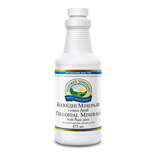 БАД Коллоидные минералы содержит концентрированный комплекс из 74 (макро- и микроэлементов), которые получены из воды Великого Соляного Озера (штат Юта, США) путем специальной технологии. В наибольшем количестве содержатся: магний, железо, селен, марганец, хром, натрий, цинк. Особый интерес вызывает наличие в составе БАД фульвовой кислоты. Это комплекс гуминовых веществ, которые переводят минеральные вещества в хелатные соединения, что повышает их усвояемость. В формуле присутствует сок ягод Асаи, которые вызвали «бум здоровья» во всём мире, а также экстракт кожуры винограда, содержащий флавоноиды. В ягодах Асаи содержатся различные биологически активные вещества, витамины, микроэлементы, стерины и антиоксиданты (флавоноиды, цианидины).