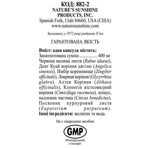 Состав - 1 капсула: листья малины красной (Rubus idaeus) - 79 мг; корень Донг Ква (Angelica sinensis) - 71 мг; корень имбиря лекарственного (Zingiber officinale) - 53 мг; корень солодки голой (Glycyrrhiza glabra) - 53 мг; корень клопогона кистевидного (Cimicifuga racemosa) - 36 мг; надземные части кникуса благословенного (Cnicus benedictus) - 36 мг; корень алтея лекарственного (Althaea officinalis) - 36 мг; листья посконника пурпурного (Eupatorium purpureum) - 36 мг.