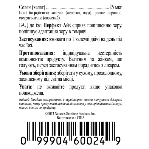 БАД к пище Перфект Айз НСП является дополнительным источником витаминов (Е, А, В2, В6), бета-каротина, лютеина, цинка, меди, хрома, селена, таурина, кверцетина, содержит глутатион, антоцианы.