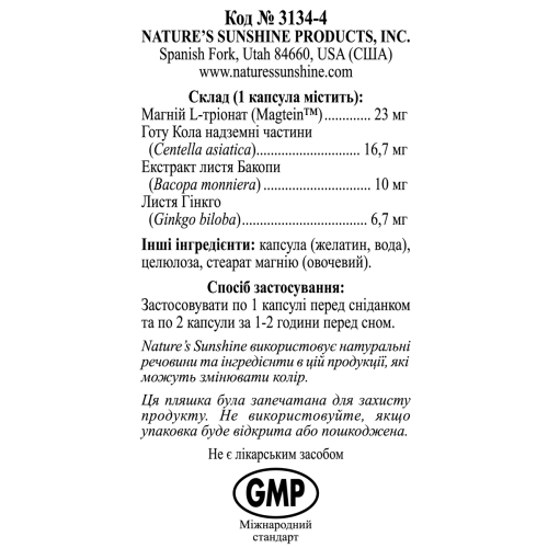 Состав – 1 капсула: магний L-треонат - 23 мг (5,8% от АСП); надземные части готу кола (Centella asiatica) -16,7 мг; экстракт листьев бакопы (Bacopa monniera) -10,0 мг; листья гинкго билоба (Ginkgo biloba) - 6,7 мг.