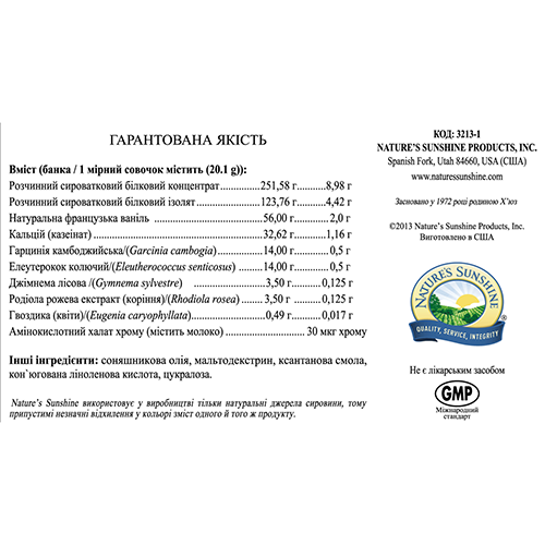 Состав (1 мерная ложка – 20 г): сывороточный белковый концентрат (80% белка) - 7,14 г; сывороточный белковый изолят (93% белка) - 4,08 г; порошок натуральной французской ванили - 1,99 г; подсолнечное масло - 1,49 г; казеинат кальция (92% белка) - 1,06 г; экстракт коры гарцинии камбоджийской (Garcinia cambogia) - 500 мг; корень элеутерококка колючего (Eleutherococcus senticosus) - 500 мг; мальтодекстрин - 500 мг; ксантановая камедь -199 мг; листья джимнемы лесной (Gymnema sylvestre) - 120 мг; экстракт корня родиолы розовой (Rhodiola rosea) - 120 мг; коньюгированная линолевая кислота (CLА) - 80 мг; цветы гвоздики (Syzygium aromaticum) - 20 мг; хром (в хелате аминокислот) - 29,8 мкг (59,6% от АСП).