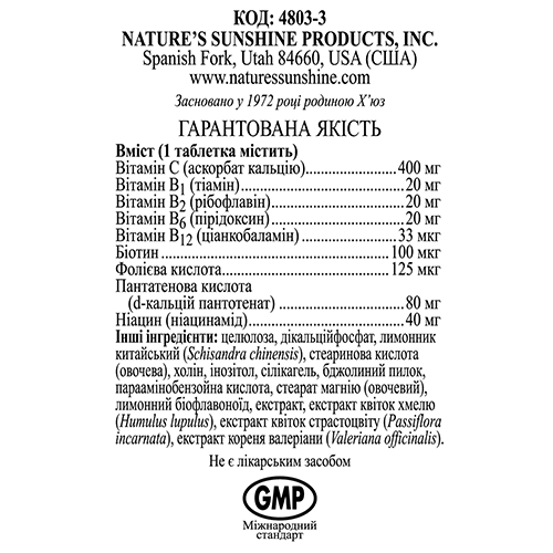 Состав (1 таблетка): Vitamin С - 400 мг, Vitamin B1 - 20 мг, Vitamin B2 - 20 мг, Vitamin B6 - 20 мг, Vitamin B12 - 33 мкг, Фолиевая кислота - 133 мкг, Биотин - 100 мкг, Пантетоновая кислота - 80 мг, Ниациномид - 40 мг.
