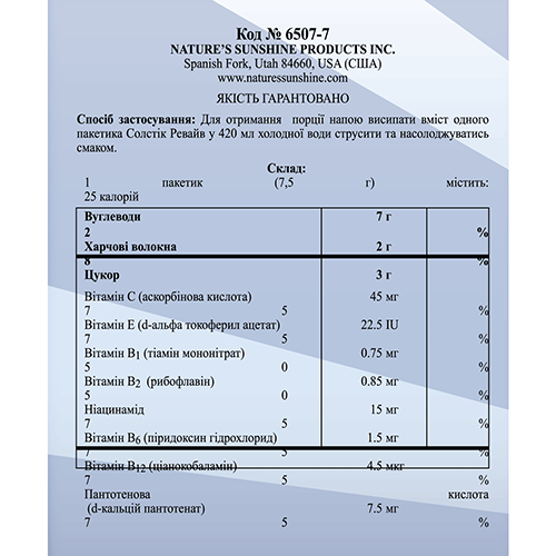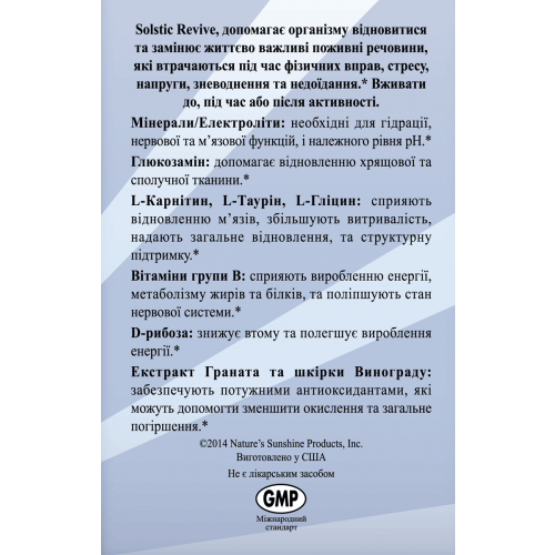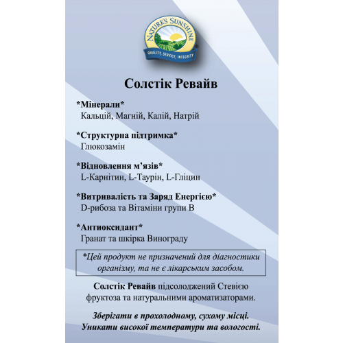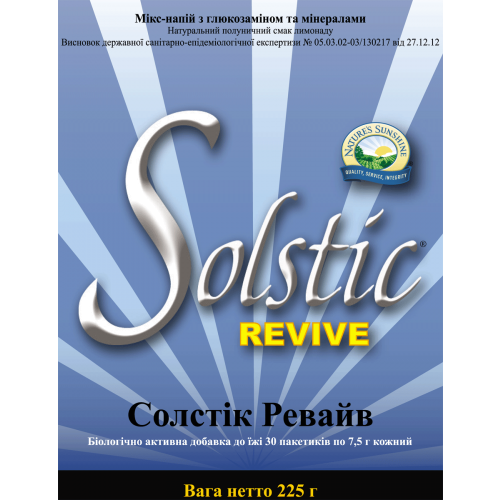 БАД к пище Солстик Ревайв является дополнительным источником глюкозамина, инулина, D-рибозы, витаминов Е, С, B1, B2, B6, B12, PP, пантотеновой кислоты, содержитстевиозиды.