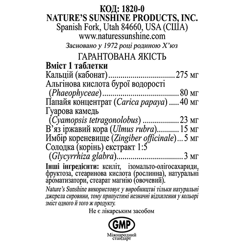 Состав - 1 таблетка: ксилит - 285 мг; фруктоза - 280 мг; кальций (в карбонате кальция) - 275 мг (27,5% от АСП); альгиновые кислоты бурых водорослей (Phaeophyceae) - 80 мг; концентрат плодов папайи (Carica papaya) - 40 мг; гуаровая камедь (Cyamopsis tetragonolobus) - 23 мг; кора ржавого вяза (Ulmus fulva) - 15 мг; корневище имбиря (Zingiber officinale) - 5 мг; экстракт корня солодки (1:5) (Glycyrrhiza glabra) - 3 мг.