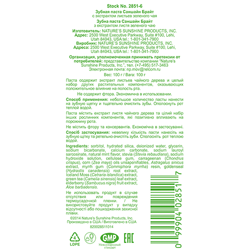 Экстракт листьев зеленого чая (Camelia sinesis) - содежит биофлавоноиды и дубильные вещества, благоприятно воздействующие на слизистую оболочку.