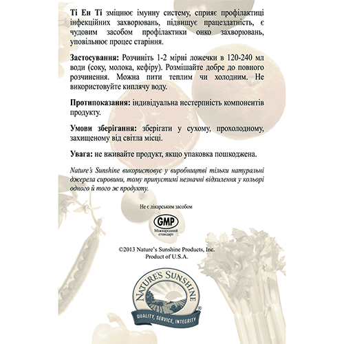 БАД к пище ТНТ является дополнительным источником пищевых волокон, витаминов (А, D, Е, С, B1, B2, B6, B12, PP, биотина, пантотеновой и фолиевой кислот), в-каротина и минеральных веществ (йода, кальция, хрома, меди, железа, магния, молибдена, селена, цинка), содержит лецитин, марганец, фосфор, калий.