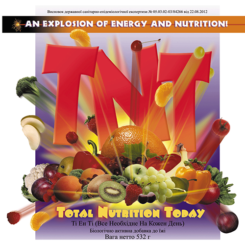 ТNТ (TotalNutritionToday – Полноценное питание сегодня) – напиток, обогащенный необходимыми для организма 12 витаминами, 12 биоэлементами, содержит в-каротин и лецитин, а также смесь пищевых растительных волокон: гуммиарабик, рисовая мука, целлюлоза, каррагенан, клетчатка сои, овса, свеклы, гороха, яблока, овсяные и кукурузные отруби, гуаровая камедь в количестве 6,5 г (в том числе 4,5 г растворимых и 2 г – нерастворимых). ТНТ также содержит 500 мг молочного белка (казеинат натрия), 0,5 г высокоолеинового подсолнечного масла, 7,8 г углеводов в виде фруктозы, кукурузного сиропа и мальтодекстрина. Калорийность – около 70 ккал.