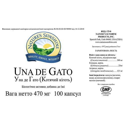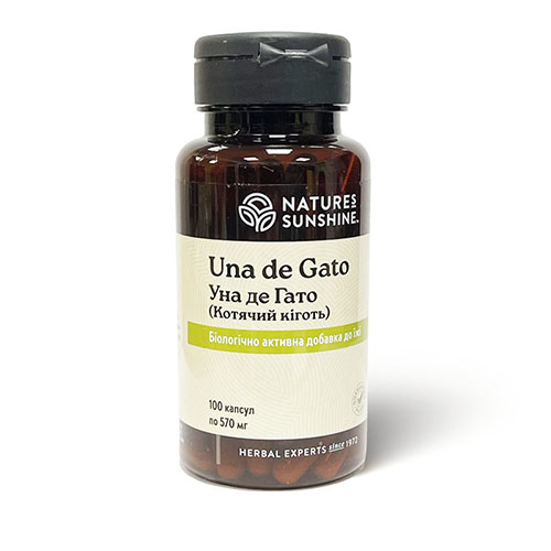 Кошачий коготь (Una de Gato) или ункария волосистая (Uncaria tomentosa)– дикорастущая лиана перуанских джунглей, по форме шипов напоминающая кошачью лапу с когтями. Ингредиенты, содержащиеся в коре, обладают выраженным иммуностимулирующим действием, активируя макрофаги и Т-лимфоциты, предотвращают агрегацию тромбоцитов и образование тромбов, вызывают снижение кровяного давления. Полифенолы, тритерпены и растительные стероиды обусловливают антиоксидантные, антивирусные, противоопухолевые и противовоспалительные свойства Уна де Гато. Применяют при иммунодефицитных и аллергических заболеваниях, воспалительных заболеваниях желудочно-кишеного тракта, язве желудка, отравлениях, дисбактериозе, заболеваниях мочеполовой системы, острых и хронических вирусных (опоясывающий лишай, генитальный герпес), бактериальных и грибковых инфекциях, при артритах, ревматизме, диабете, кожных язвах, нарушении менструального цикла. Экстракт Уна де Гато обладает цитостатическим действием (подавляет деление клеток), именно поэтому его используют для помощи пациентам со злокачественными образованиями.