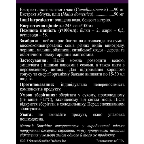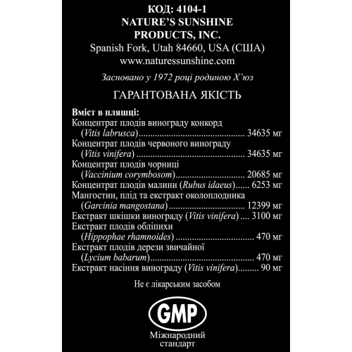 Состав в 15 мл концентрата: концентрат сока виноградного американского (Vitis labrusca) - 1,13 г; концентрат сока винограда обыкновенного (Vitis vinifera) - 1,13 г; концентрат сока голубики (Vaccinium corymbosom) - 677 мг; концентрат сока малины обыкновенной (Rubus idaeus) - 205 мг; экстракт сока и плоды мангостина (Garcinia mangostana) - 406 мг; экстракт кожицы винограда (Vitis Vinifera) - 102 мг; экстракт дерезы обыкновенной (Lycium babarum) - 15 мг; экстракт облепихи (Hippophae rhamnoides) - 15 мг; экстракт косточек винограда (Vitis vinifera) - 2,9 мг; экстракт зеленого чая (Camellia sinensis) - 2,9 мг; экстракт яблочного сока (Malus domestica) - 2,9 мг.